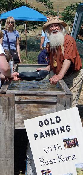 HAVE GOLD PANS WILL TRAVEL. I bet 500 kids came through today, said Russ Kurz, who dredges gold flecks from the American River in Coloma, and put them in his trough, with plenty of sand. He did gold panning demonstrations all day. Kids were allowed to keep the tiny nuggets they pulled from his sluice. Mother Lode News photo by Mike Roberts