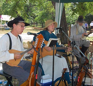 SOUNDTRACK FOR A HISTORY CELEBRATION - Old time music by Alan Fuller, Jenny Rutherford and Cowboy Hayes kept everyone smiling at Clarksville Day, 2009. The costumed trio might have stepped out of an 1860s Clarksville saloon. Cowboy Hayes laced the performance with comedy and bits of first person living history. Rutherford and Fuller sang intricate harmonies and call-and-response numbers that evoked a different era. These guys are superb musicians. Mother Lode News photo by Mike Roberts