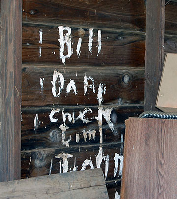 WHO ARE THESE PEOPLE? - And why are there names scrawled on the wall of this Clarksville shed? Mother Lode News photo by Mike Roberts